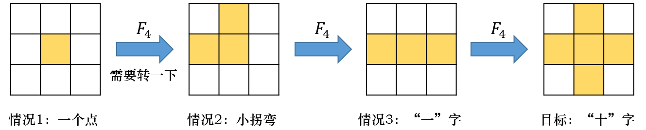 这一个步骤,只观察顶面棱块和中心块,也就是只关心这个 5 个块,一共只会出现4总情况: