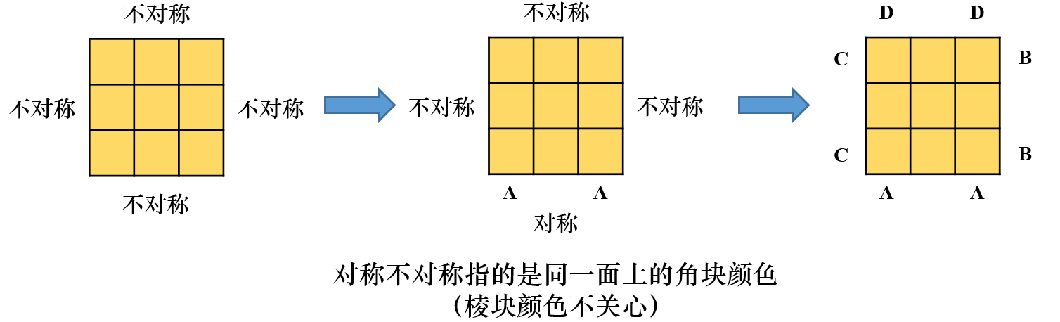 这一步的目的就是让顶面9个块颜色变为一致(只需要调整顶层四个角块的朝向)。公式依然只有一个,虽然确实是有别的公式可以更快完成,但是本着“傻瓜公式”原则,只需要记一个公式即可。