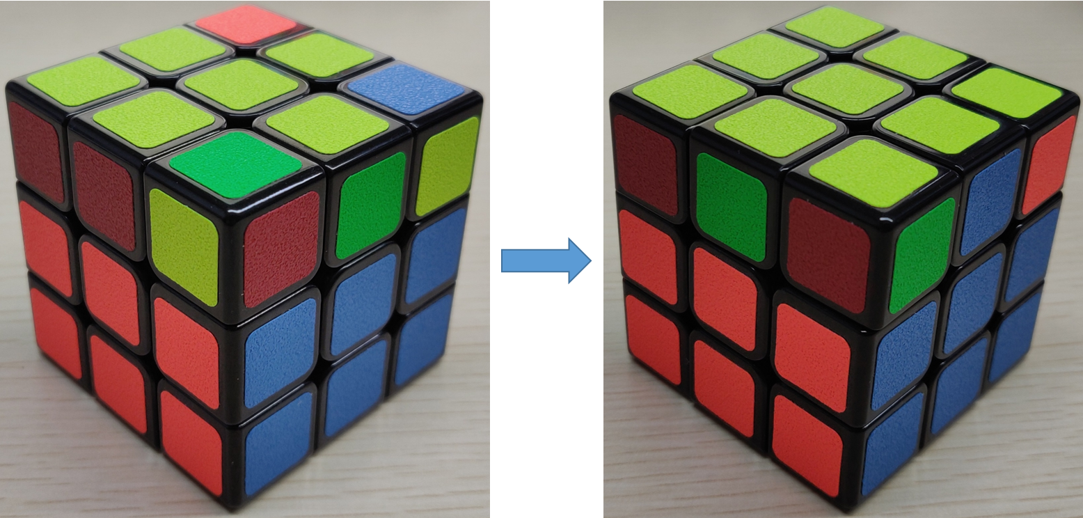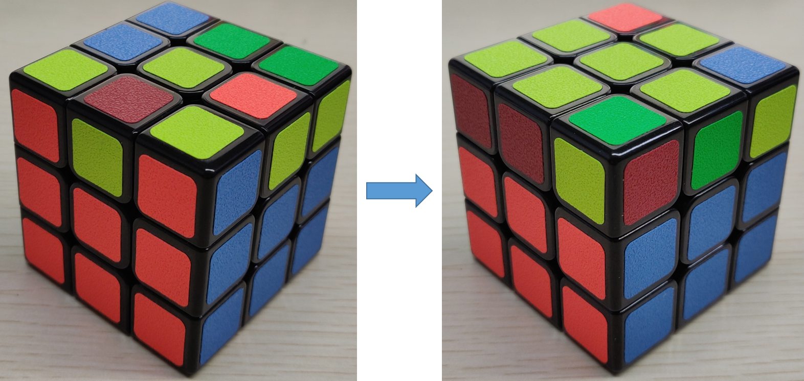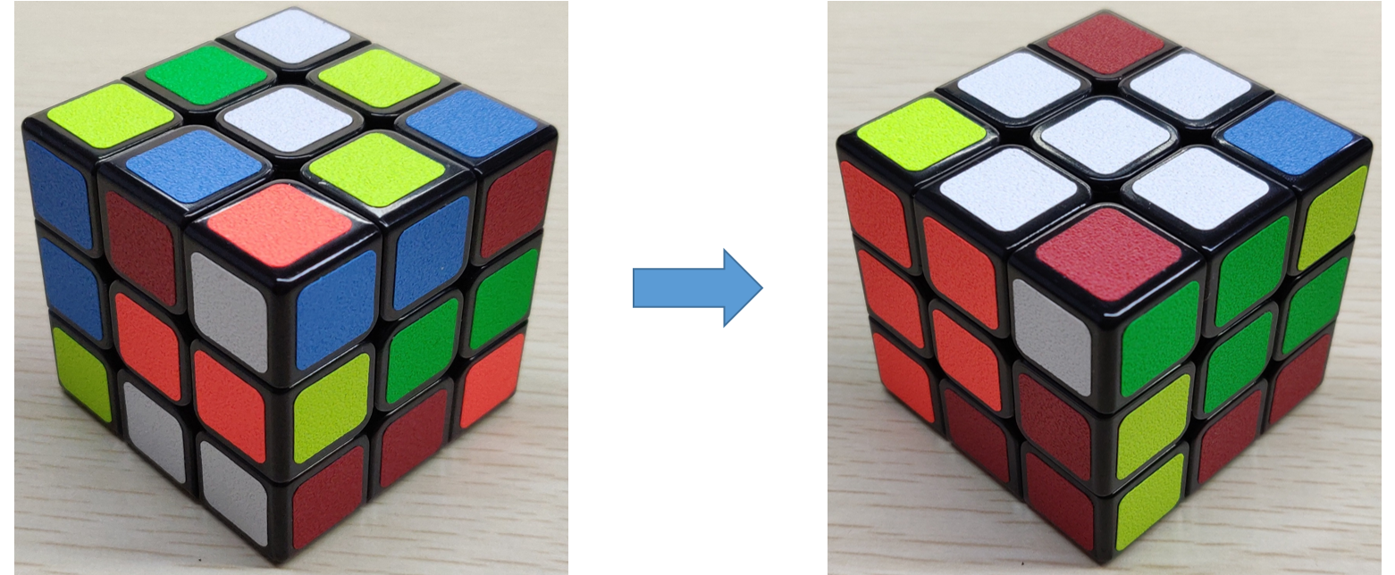 多转几次就会发现,其实这个公式5,是让顶面的四个角块交叉变换,如下图所示。
