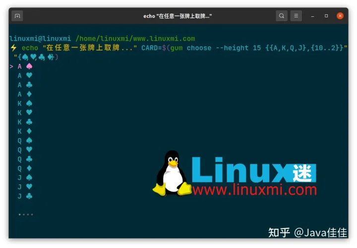 $ echo "在任意一张牌上取牌..." CARD=$(gum choose --height 15 {{A,K,Q,J},{10..2}}" "{♠,♥,♣,♦})