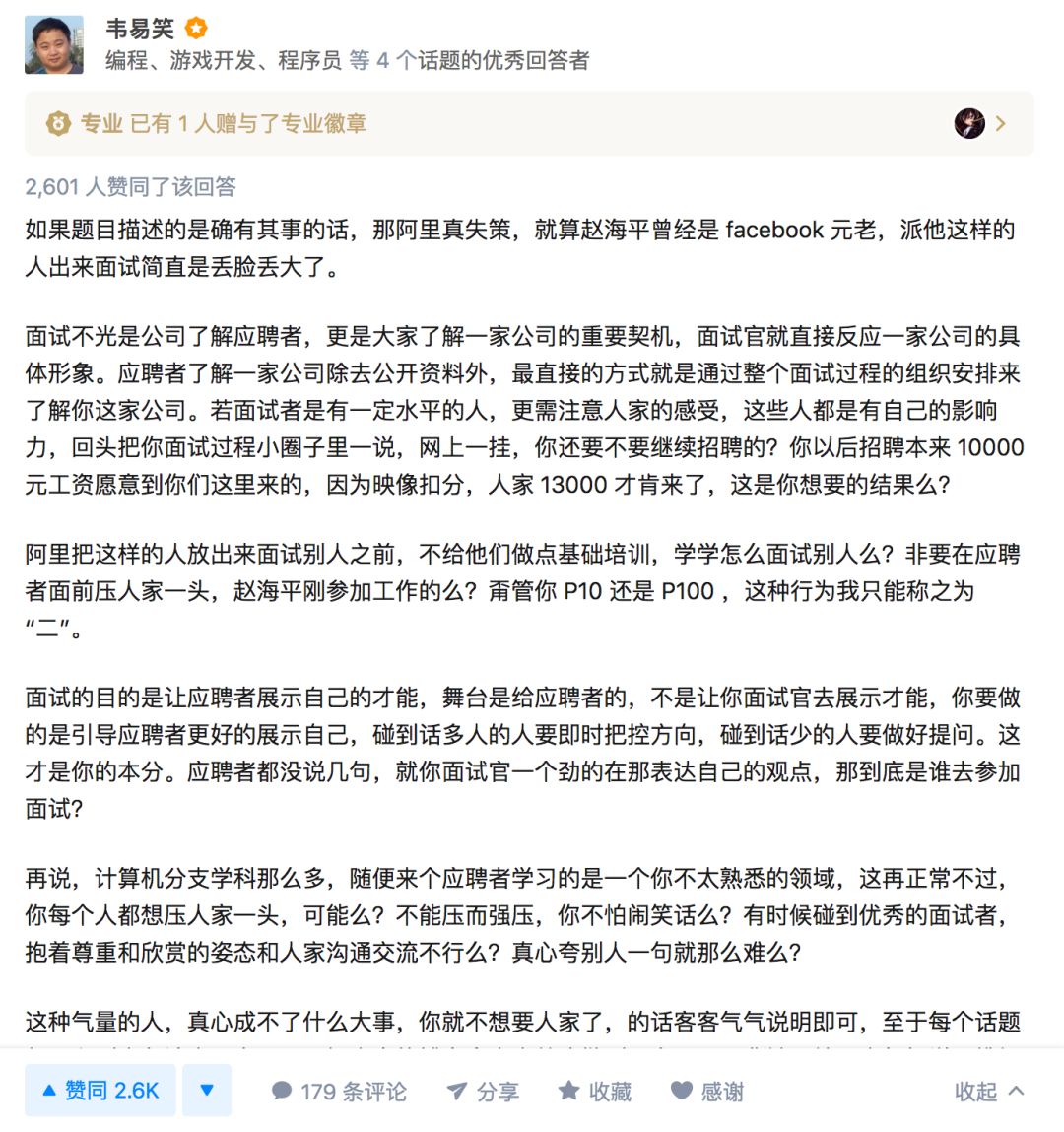 事件自12日发酵至今,终于迎来第一个热搜“如何评价阿里P10赵海平对王垠的面试?”对于坊间传闻四起,今日赵海平第一次公开回复了王垠,以下为赵海平回复王垠全文: