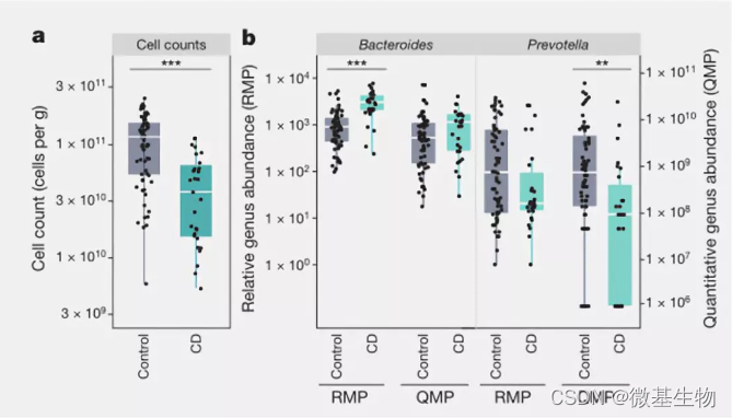 对29例克罗恩病患者和健康人的样本进行高通量和绝对定量数据分析。同时进行流式细胞仪分析检测,克罗恩病患者粪便样品中的细胞数比健康对照组低3倍。在使用绝对定量数据(QMP)时,普雷沃菌属Prevotella才在克罗恩病患者中发现显著降低。与流式细胞仪分析检测结果一致。