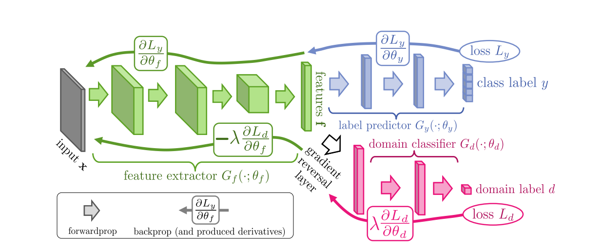 在反向传播更新参数的过程中,梯度下降是最小化目标函数,而特征提取器任务是最大化label分类准确率但最小化域分类准确率,因此要最大化域判别器目标函数。因此,在域分类器和特征提取器中间有一个梯度反转层(Gradient reversal layer),在粉色部分的参数向Ld减小的方向优化,绿色部分的梯度向Ld增大的方向优化,用一个网络一个优化器就实现了两部分有不一样的优化目标,形成对抗的关系。