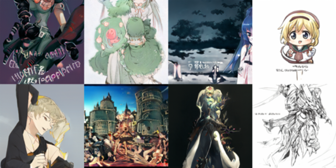 from IPython.display import displaydef concat_imgs_bsz8(imgs):np_imgs = [np.asarray(img) for img in imgs]img1 = np.concatenate(np_imgs[:4], 1)img2 = np.concatenate(np_imgs[4:], 1)img = Image.fromarray(np.concatenate([img1, img2], 0))return img.resize([img.size[0]//2, img.size[1]//2])imgs = std_gen(8, seed=233)