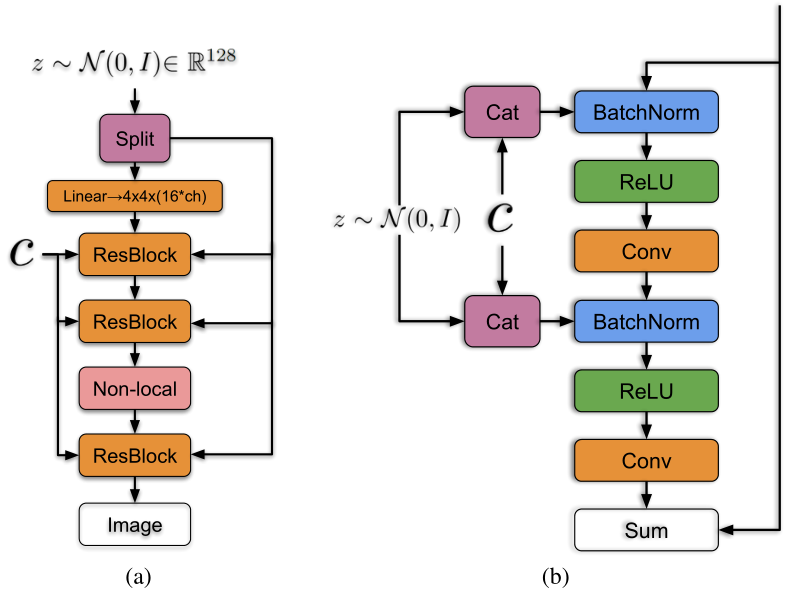 如下图,将潜向量z分成多块,然后和条件标签c连接后一起送入到生成网络的各个层中,对于生成网络的每一个残差块又可以进一步展开为右图的结构。可以看到潜向量z的块和条件标签c在残差块下是通过合并操作后送入批次归一化层,其中这种嵌入是共享嵌入,线性投影到每个层的偏置和权重上。