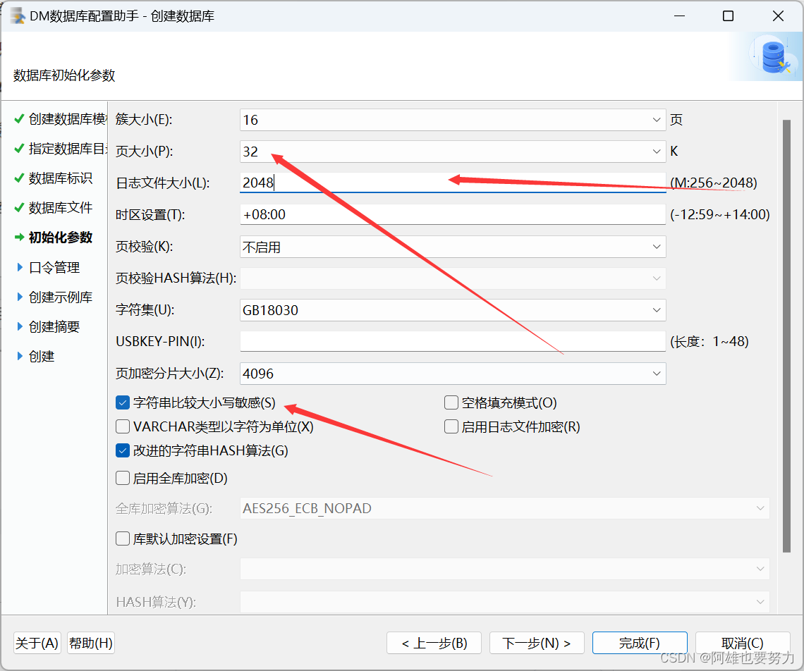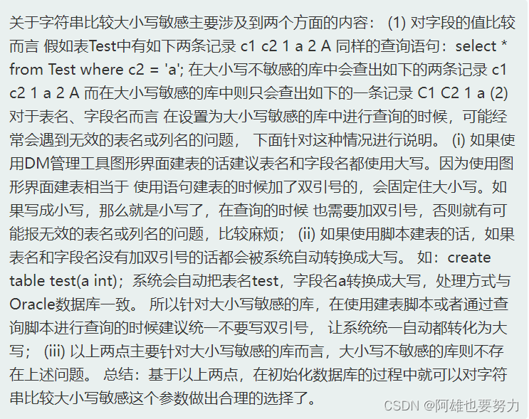这个可以修改一下:页大小选择32;日志文件可以选择2048;字符大小写可以点也可以不点(个人用Mysql习惯不敏感 ,所以我是取消的)区别官方的解释如下图: