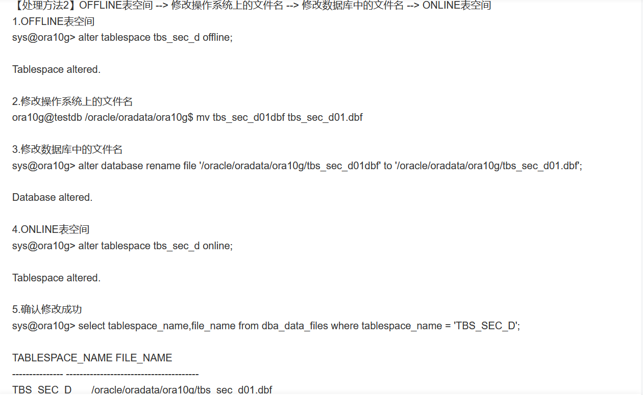 2、【处理方法2】OFFLINE表空间 --> 修改操作系统上的文件名 --> 修改数据库中的文件名 --> ONLINE表空间