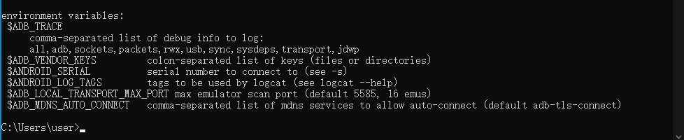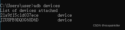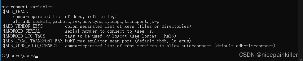 ➥ 检查 adb, 如果不是下面 的页面说明;要么配置下 环境变量;要么在 adb.exe 文件夹中执行 adb ;如果你没有 去你 Android SDK 地址拿一个也行