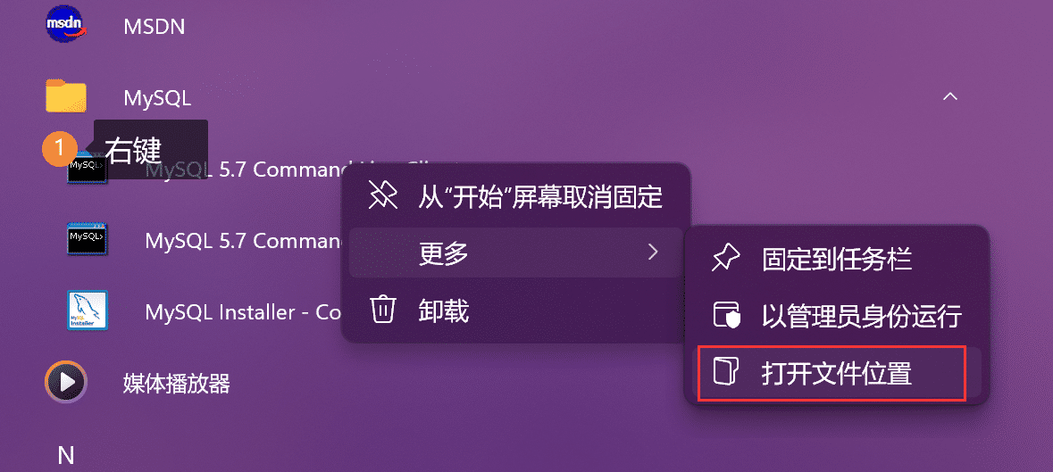 在开始菜单栏找到 MySQL 这个软件, 右键打开文件所开位置