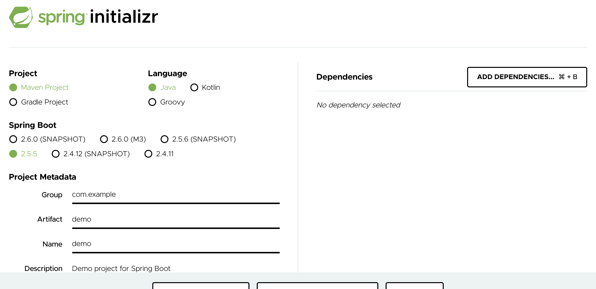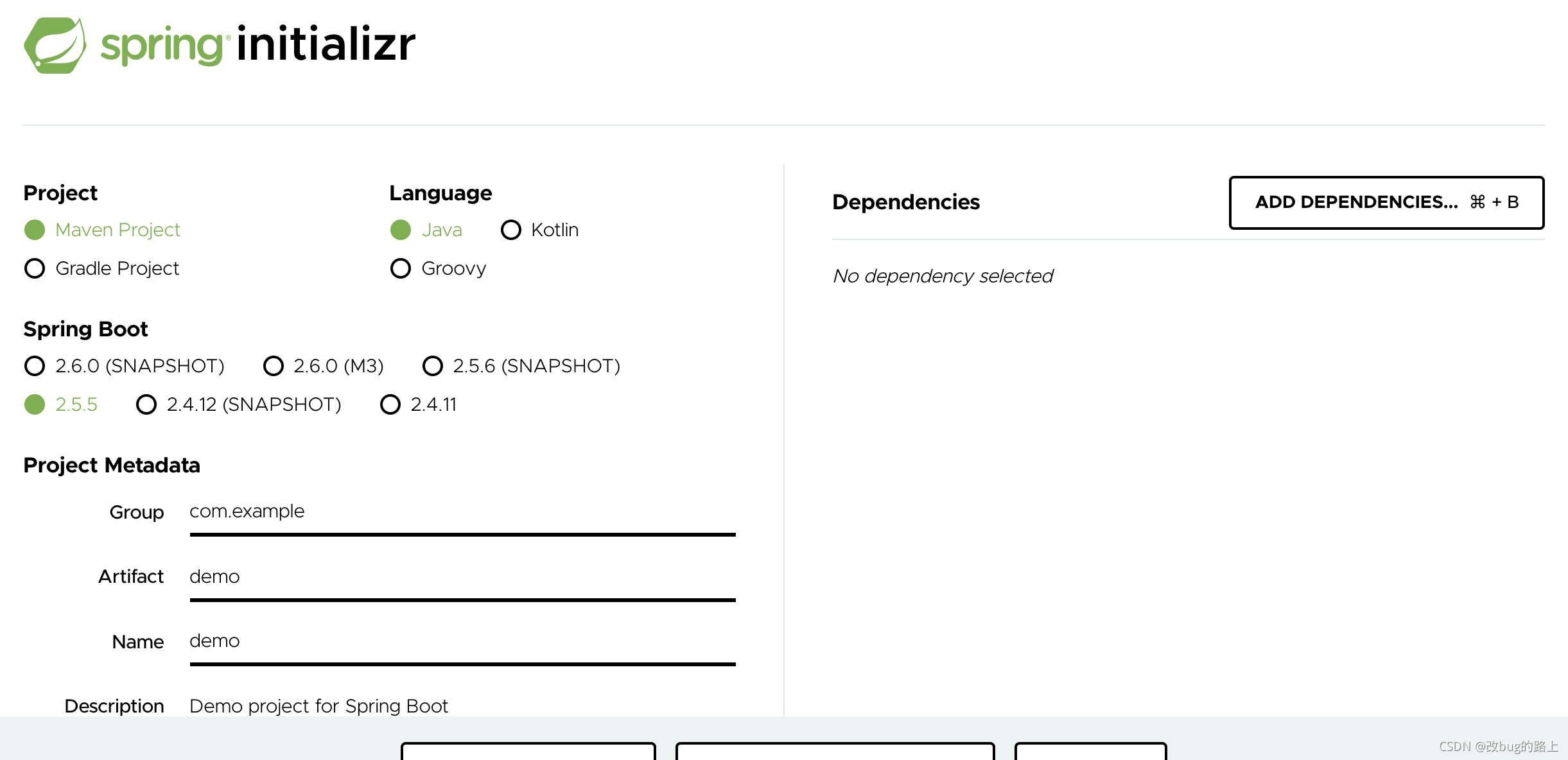 - 首先手动创建一个springboot项目,可以去springboot官网上生成,也可以用idea自己创建,我的idea是社区版,无法自己创建,用的官网自动生成,网址: https://start.spring.io/