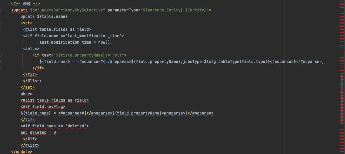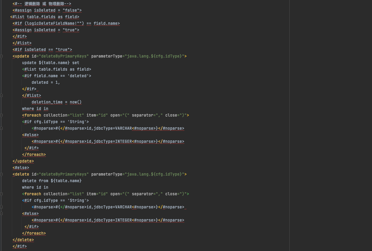 以下是逻辑删除生成sql的模板代码