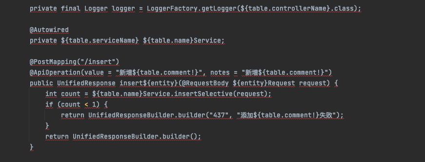 - controller模板,我项目中是按照自己需要写的,不适用其它项目,这里就不描述,说一下思路:如果你的项目中的接口基本差不多,入参出参都有统一规范,可以自己先写好一个controller,然后以这个controller为模板,写对应的代码,下面是我的其中一个接口,仅供参考