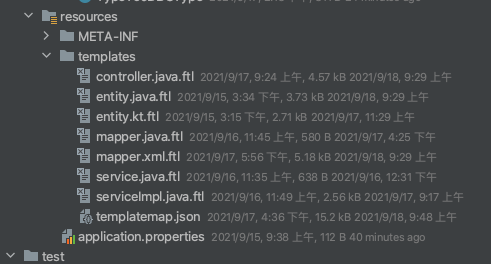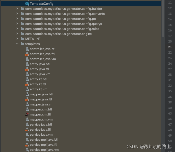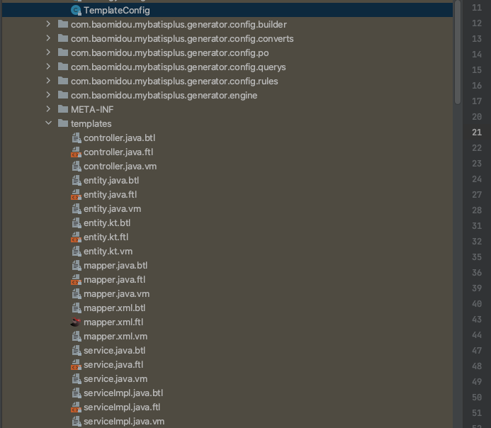 找到mybatis-plus包中的模板,拷贝出来,放到templates文件夹下,我这里使用的模板是freemaker,所以知悉要保留对应的模板就可以了,freemaker模板对应的文件后缀是.ftl
