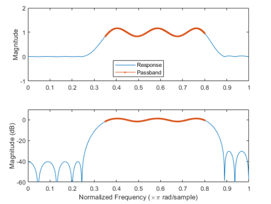 pb = linspace(pf1,pf2,1e3)*pi;bp = designfilt('bandpassfir', ...'StopbandAttenuation1',40, 'StopbandFrequency1',sf1,...'PassbandFrequency1',pf1,'PassbandRipple',3,'PassbandFrequency2',pf2, ...'StopbandFrequency2',sf2,'StopbandAttenuation2',30);[h,w] = freqz(bp,1024);