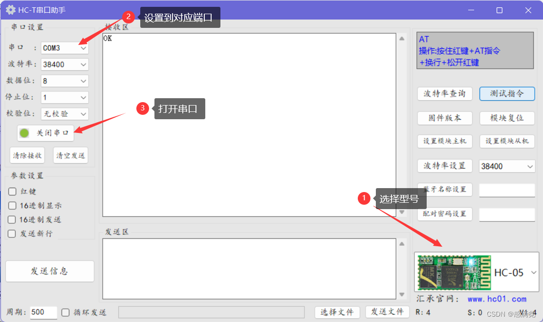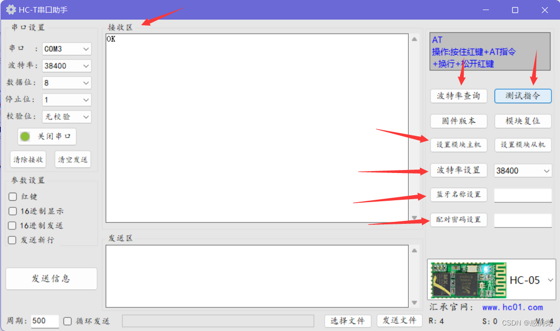 这是我买的HC05提供是上面的一个串口助手,按图片来操作,先进AT模式再配置,