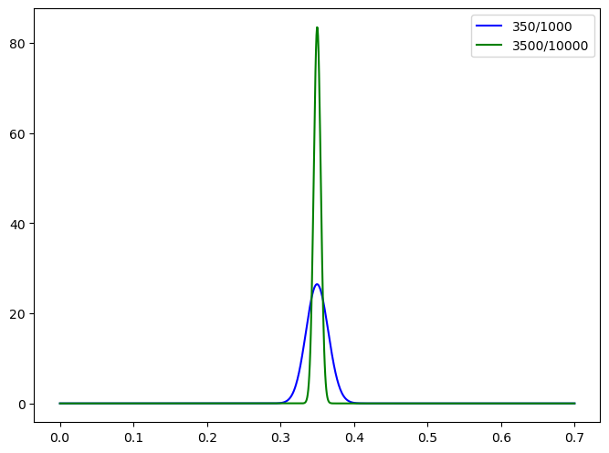 x = np.linspace(0,0.7,1000)plt.plot(x,stats.beta.pdf(x,a=350,b=650),c='b',label='350/1000')plt.plot(x,stats.beta.pdf(x,a=3500,b=6500),c='g',label='3500/10000')plt.legend()plt.show()