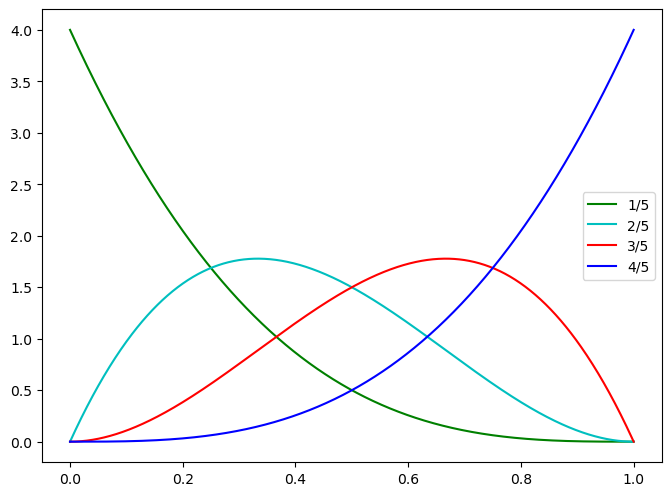再举个例子,假如老张的孙子也想做做运动员,老张煞有介事的统计了小小张的历史三分投数,为5投1中。问他下一次投球,也就是第六次投球,命中的概率的分布是怎样的?如果过去是5投2中,5投3中,和5投4中呢?