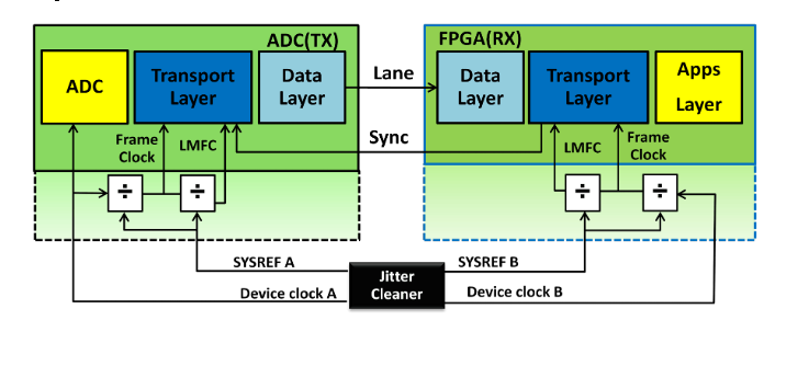 device clock 是器件工作的主时钟,一般在模数转换器里为采样时钟或者整数倍频的时钟,其协议本身的帧和多帧时钟也是基于device clock 。sysref是用于指示不同转换器或者逻辑的device clock的沿,或者不同器件间的deterministic latency 的参考。