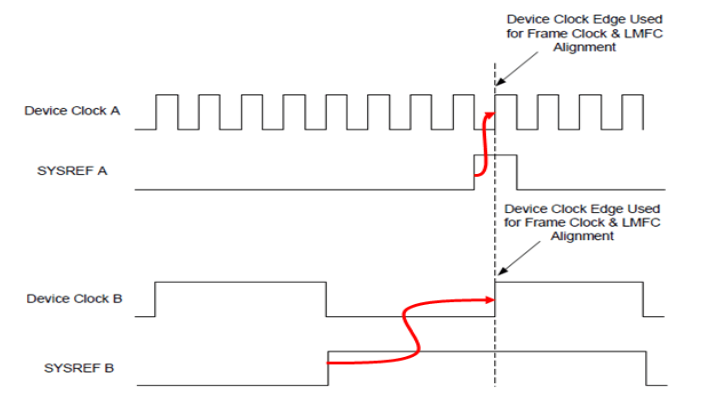 device clock 和sysref必须满足的时序关系。sysref 的第一个上升沿要非常容易的能被device clock捕捉到。通常会因为PCB 的线长以及时钟器件不同,通道输出时的skew会带来一定的误差,device clock的上升沿不一定正好在sysref 的脉冲正中间,工程上只要在一定范围内就能保证JESD204收发正常工作。