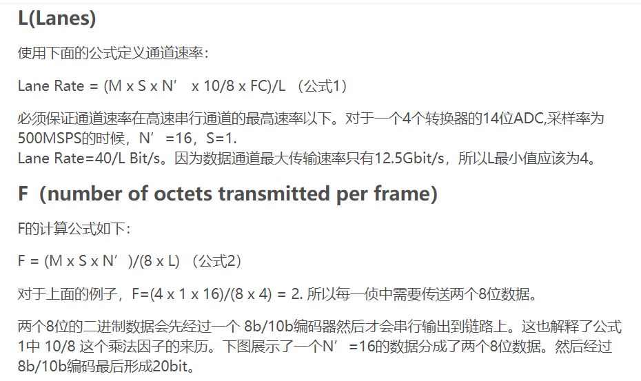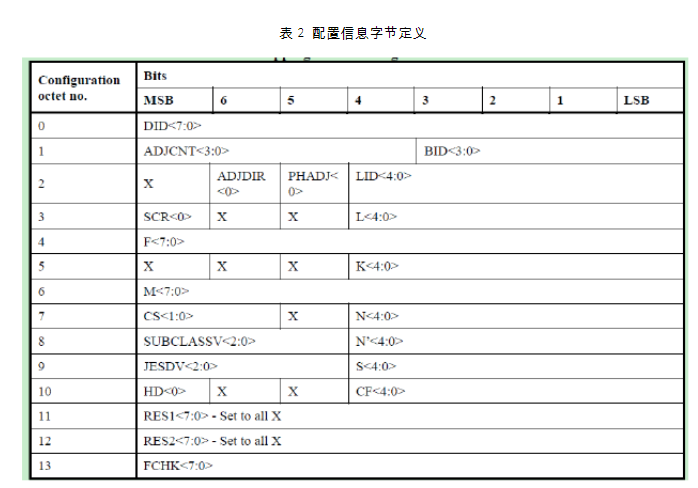 ILA:初始化多帧序列 (initial lane alignment)该阶段发送连续4个初始化多帧(多帧是由K个帧组成,字节数为K*F),此样本数据段不进行扰码和字节替换。初始化多帧以8B10B中的K28.0开始以K28.3结束,其中第二个多帧的第二字节K28.4关键字用来指示当前多帧在紧跟着K28.4的后续14个字节是参数配置信息。表2是具体的配置参数定义。