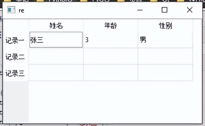 {QStandardItemModel* model = new QStandardItemModel(this);/*设置列字段名*/model->setColumnCount(3);model->setHeaderData(0,Qt::Horizontal, "姓名");model->setHeaderData(1,Qt::Horizontal, "年龄");model->setHeaderData(2,Qt::Horizontal, "性别");/*设置行字段名*/model->setRowCount(3);model->setHeaderData(0,Qt::Vertical, "记录一");model->setHeaderData(1,Qt::Vertical, "记录二");model->setHeaderData(2,Qt::Vertical, "记录三");/*设置一条数据*/model->setItem(0, 0, new QStandardItem("张三"));model->setItem(0, 1, new QStandardItem("3"));model->setItem(0, 2, new QStandardItem("男"));this->setModel(model);