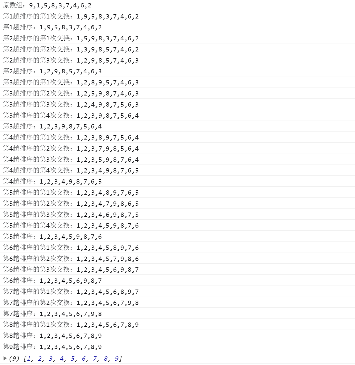 function bubbleSortBetter(arr){//外层循环,控制趟数,每一次找到一个最大值for (var i = 0; i < arr.length - 1; i++) {// 内层循环,控制比较的次数,并且判断两个数的大小var num = 1;var flag = true;for (var j = 0; j < arr.length - 1 - i; j++) {// 如果前面的数大,放到后面(当然是从小到大的冒泡排序)if (arr[j] > arr[j+1]) {var temp = arr[j+1];arr[j+1] = arr[j];arr[j] = temp;flag = false;console.log('第' + (i+1) + '趟排序的第'+(num++)+'次交换:' + arr); // 标记交换}}if(flag){break;}console.log('第' + (i+1) + '趟排序:' + arr);// 标记趟数}return arr;