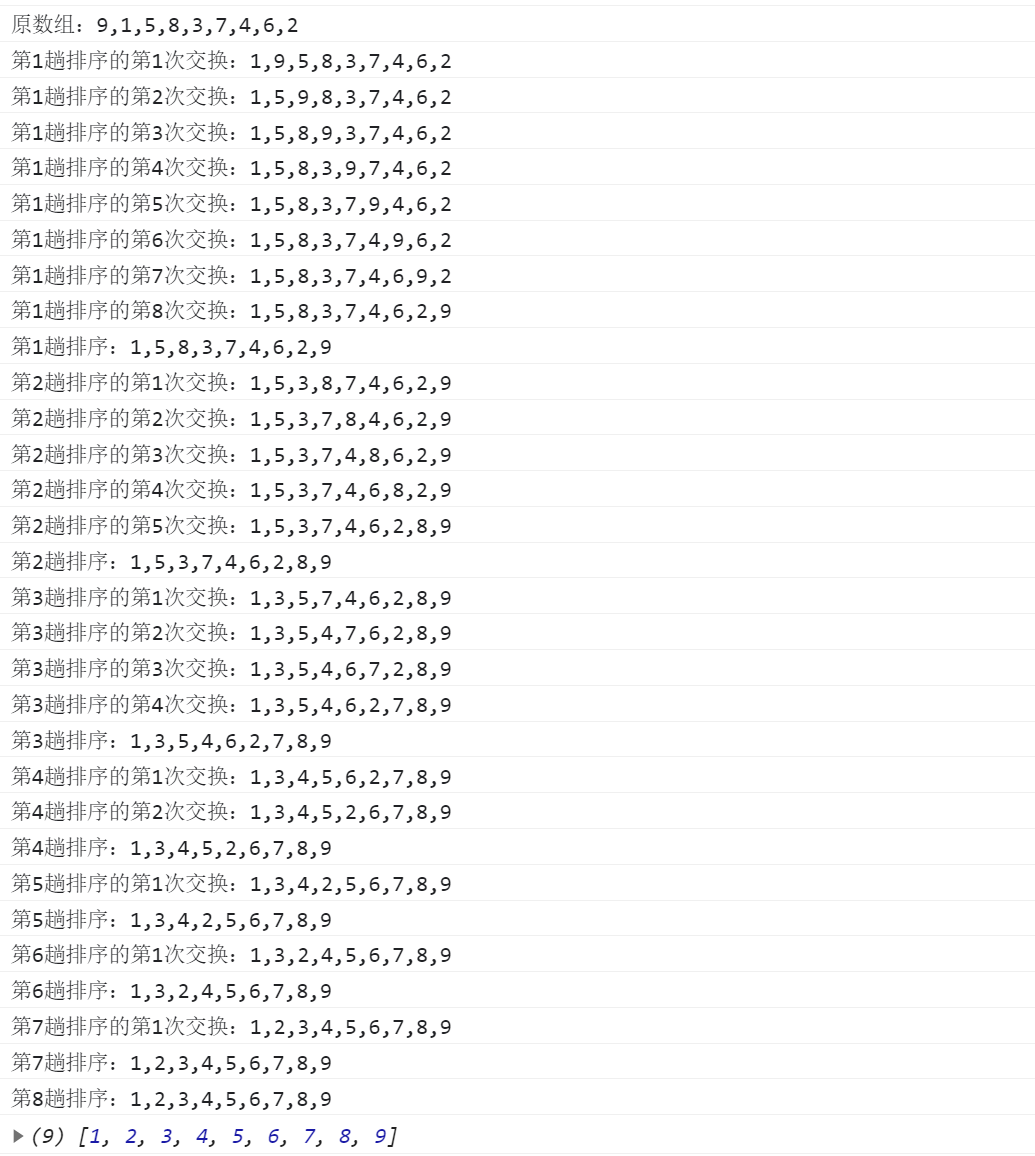 function bubbleSort(arr){//外层循环,控制趟数,每一次找到一个最大值for (var i = 0; i < arr.length - 1; i++) {// 内层循环,控制比较的次数,并且判断两个数的大小var num = 1;for (var j = 0; j < arr.length - 1 - i; j++) {// 如果前面的数大,放到后面(当然是从小到大的冒泡排序)if (arr[j] > arr[j+1]) {var temp = arr[j+1];arr[j+1] = arr[j];arr[j] = temp;console.log('第' + (i+1) + '趟排序的第'+(num++)+'次交换:' + arr); // 标记交换}}console.log('第' + (i+1) + '趟排序:' + arr);// 标记趟数}return arr;