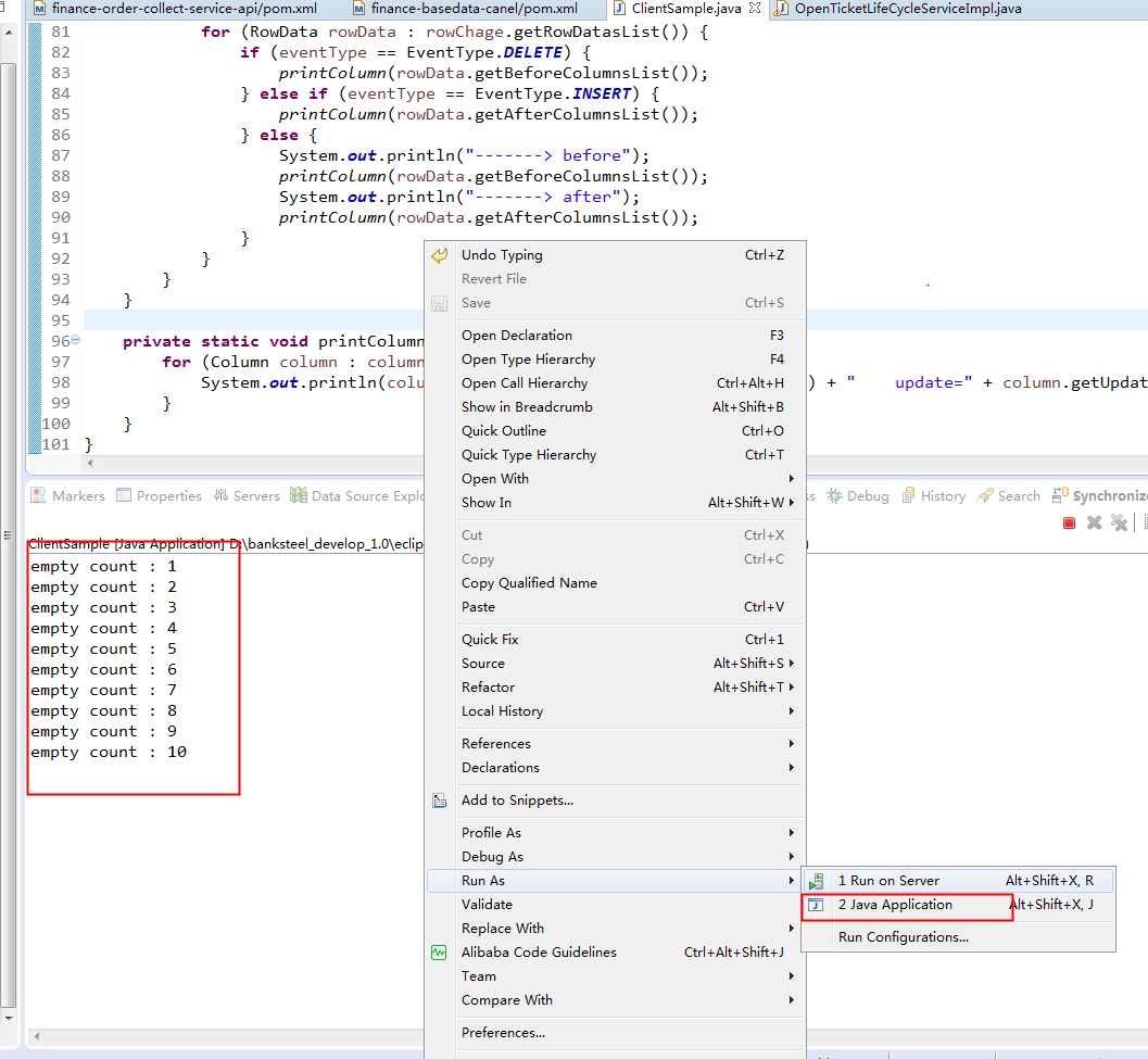 import com.alibaba.otter.canal.client.*;public class ClientSample {public static void main(String args[]) {// 创建链接CanalConnector connector = CanalConnectors.newSingleConnector(new InetSocketAddress(AddressUtils.getHostIp(),11111), "example", "", "");int batchSize = 1000;int emptyCount = 0;try {connector.connect();connector.subscribe(".*\\..*");connector.rollback();int totalEmtryCount = 1200;while (emptyCount < totalEmtryCount) {Message message = connector.getWithoutAck(batchSize); // 获取指定数量的数据long batchId = message.getId();int size = message.getEntries().size();if (batchId == -1 || size == 0) {emptyCount++;System.out.println("empty count : " + emptyCount);try {Thread.sleep(1000);} catch (InterruptedException e) {e.printStackTrace();}} else {emptyCount = 0;// System.out.printf("message[batchId=%s,size=%s] \n", batchId, size);printEntry(message.getEntries());}connector.ack(batchId); // 提交确认// connector.rollback(batchId); // 处理失败, 回滚数据}System.out.println("empty too many times, exit");} finally {connector.disconnect();}}private static void printEntry(List<Entry> entrys) {for (Entry entry : entrys) {if (entry.getEntryType() == EntryType.TRANSACTIONBEGIN || entry.getEntryType() == EntryType.TRANSACTIONEND) {continue;}RowChange rowChage = null;try {rowChage = RowChange.parseFrom(entry.getStoreValue());} catch (Exception e) {throw new RuntimeException("ERROR ## parser of eromanga-event has an error , data:" + entry.toString(),e);}EventType eventType = rowChage.getEventType();System.out.println(String.format("================> binlog[%s:%s] , name[%s,%s] , eventType : %s",entry.getHeader().getLogfileName(), entry.getHeader().getLogfileOffset(),entry.getHeader().getSchemaName(), entry.getHeader().getTableName(),eventType));for (RowData rowData : rowChage.getRowDatasList()) {if (eventType == EventType.DELETE) {printColumn(rowData.getBeforeColumnsList());} else if (eventType == EventType.INSERT) {printColumn(rowData.getAfterColumnsList());} else {System.out.println("-------> before");printColumn(rowData.getBeforeColumnsList());System.out.println("-------> after");printColumn(rowData.getAfterColumnsList());}}}}private static void printColumn( List<Column> columns) {for (Column column : columns) {System.out.println(column.getName() + " : " + column.getValue() + " update=" + column.getUpdated());}}
