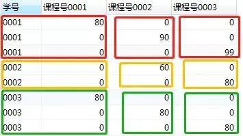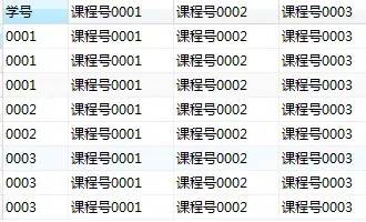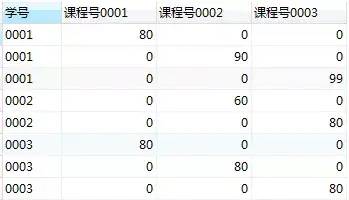 在这个查询结果中,每一行表示了某个学生某一门课程的成绩。比如第一行是'学号0001'选修'课程号00001'的成绩,而其他两列的'课程号0002'和'课程号0003'成绩为0。