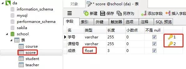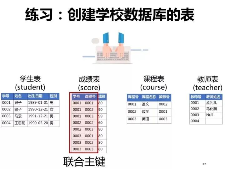 成绩表是学生的成绩,里面有学号(学生的学号),课程号(学生选修课程的课程号),成绩(学生选修该课程取得的成绩)