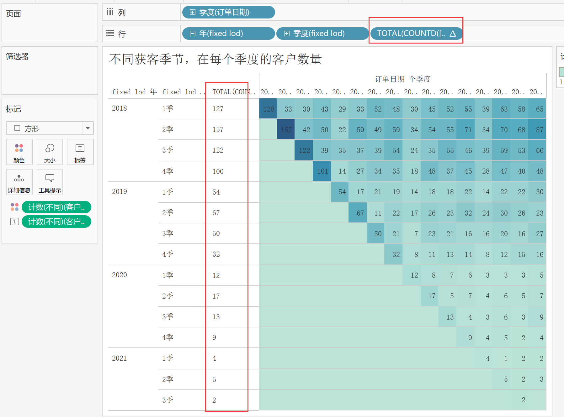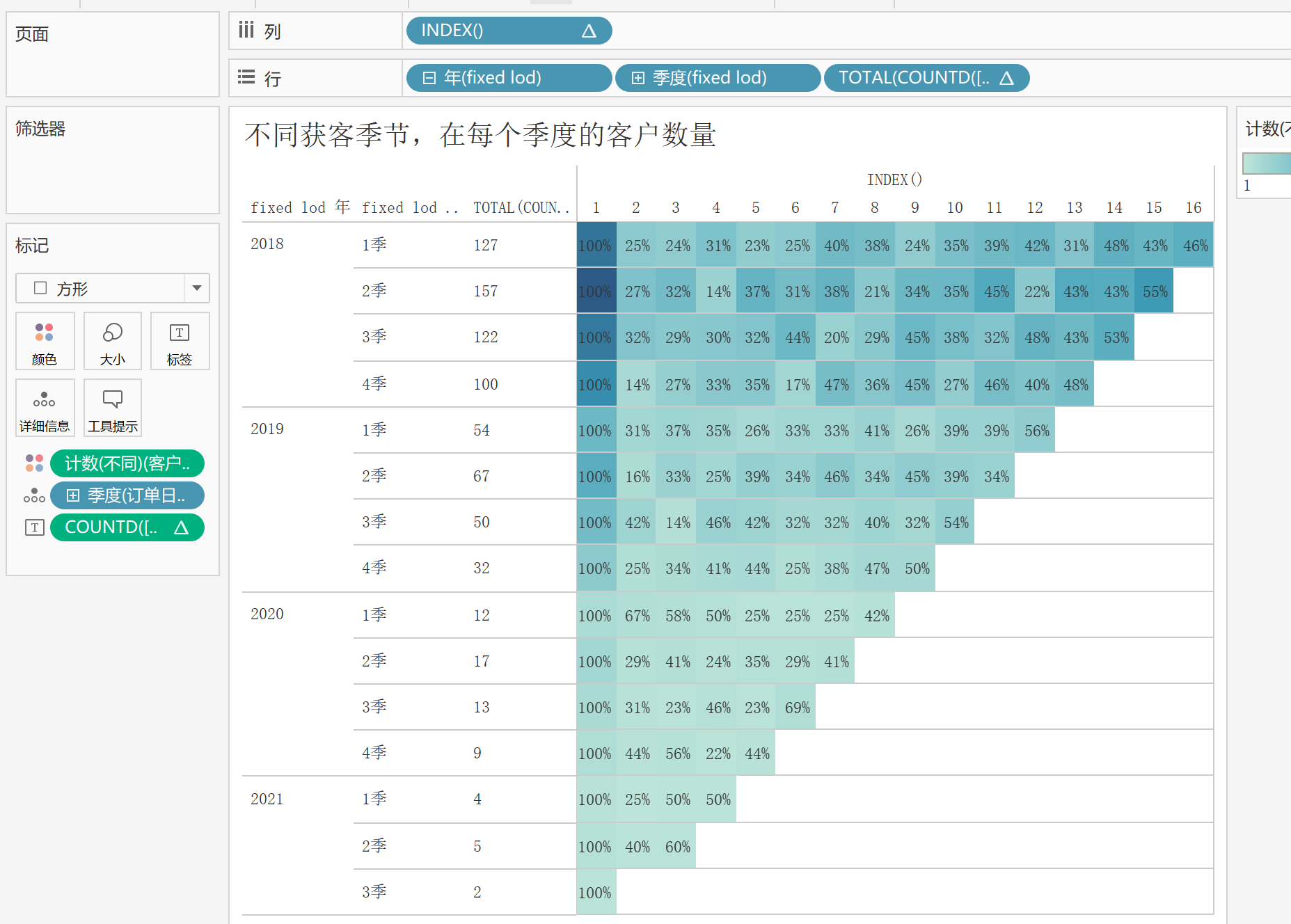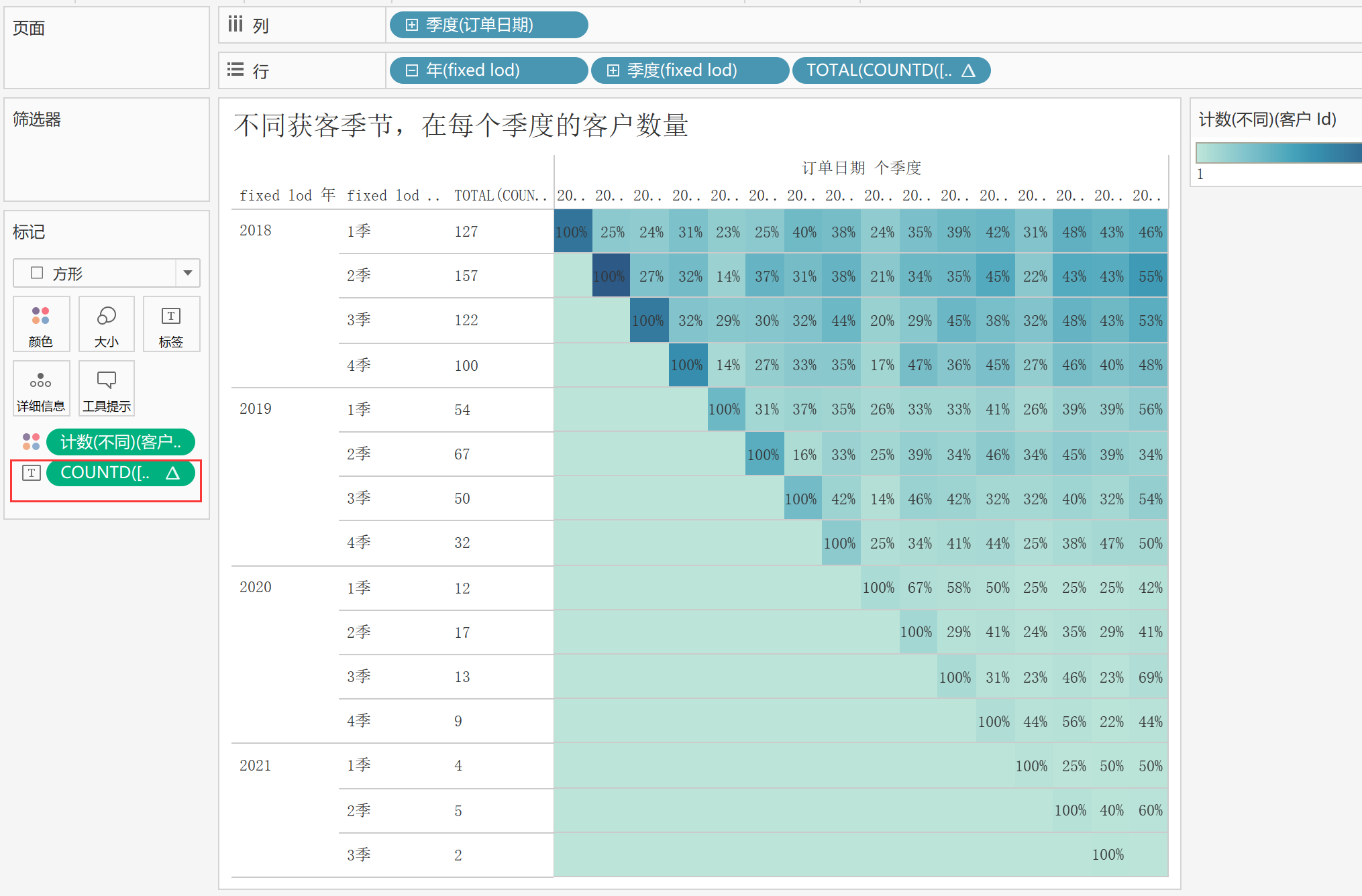 问题a就是要找到每个获客季度的客户数量,这个数据是可以由不同消费日期的客户数量,通过不重复的计算countd获得。获客季度的客户数量,层次高于当前视图。