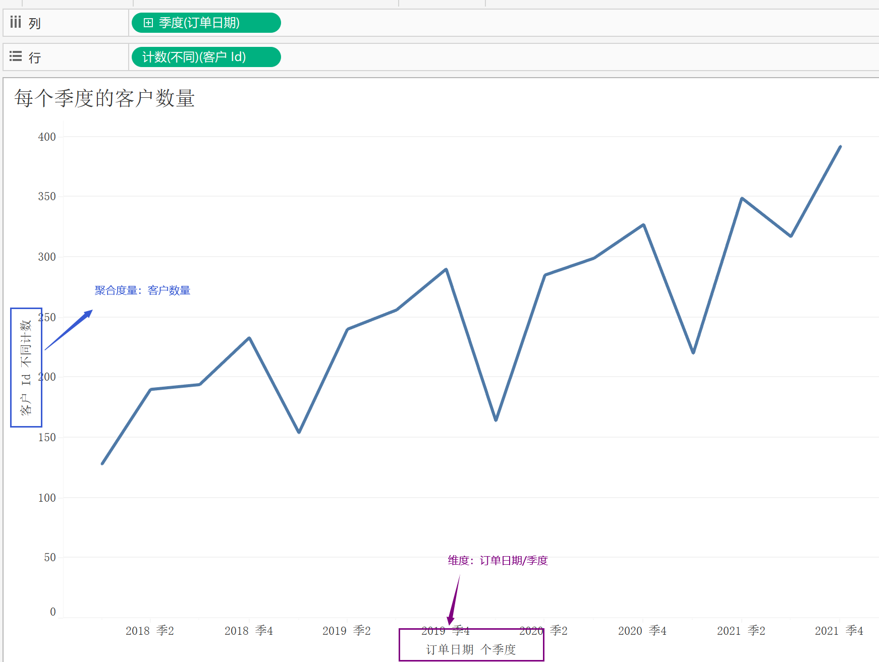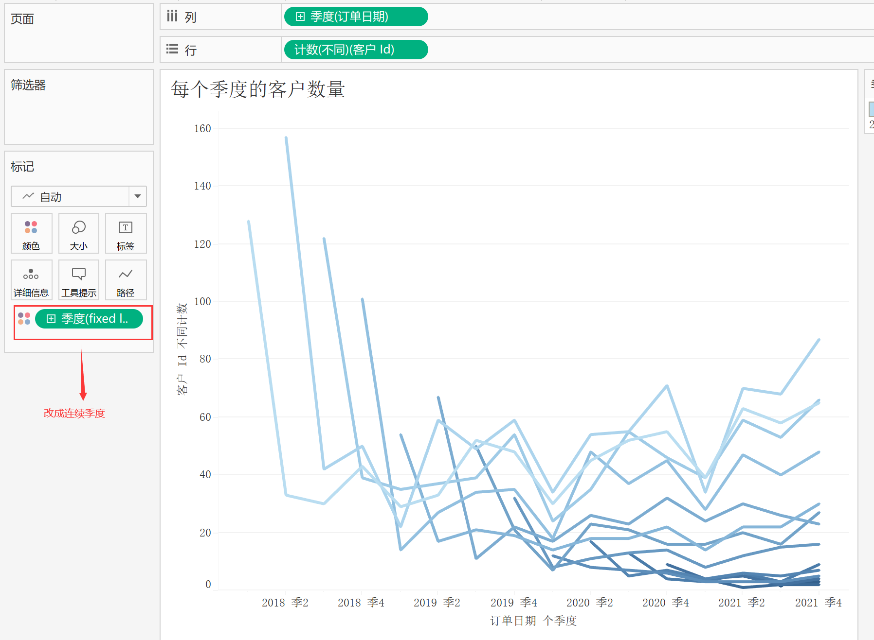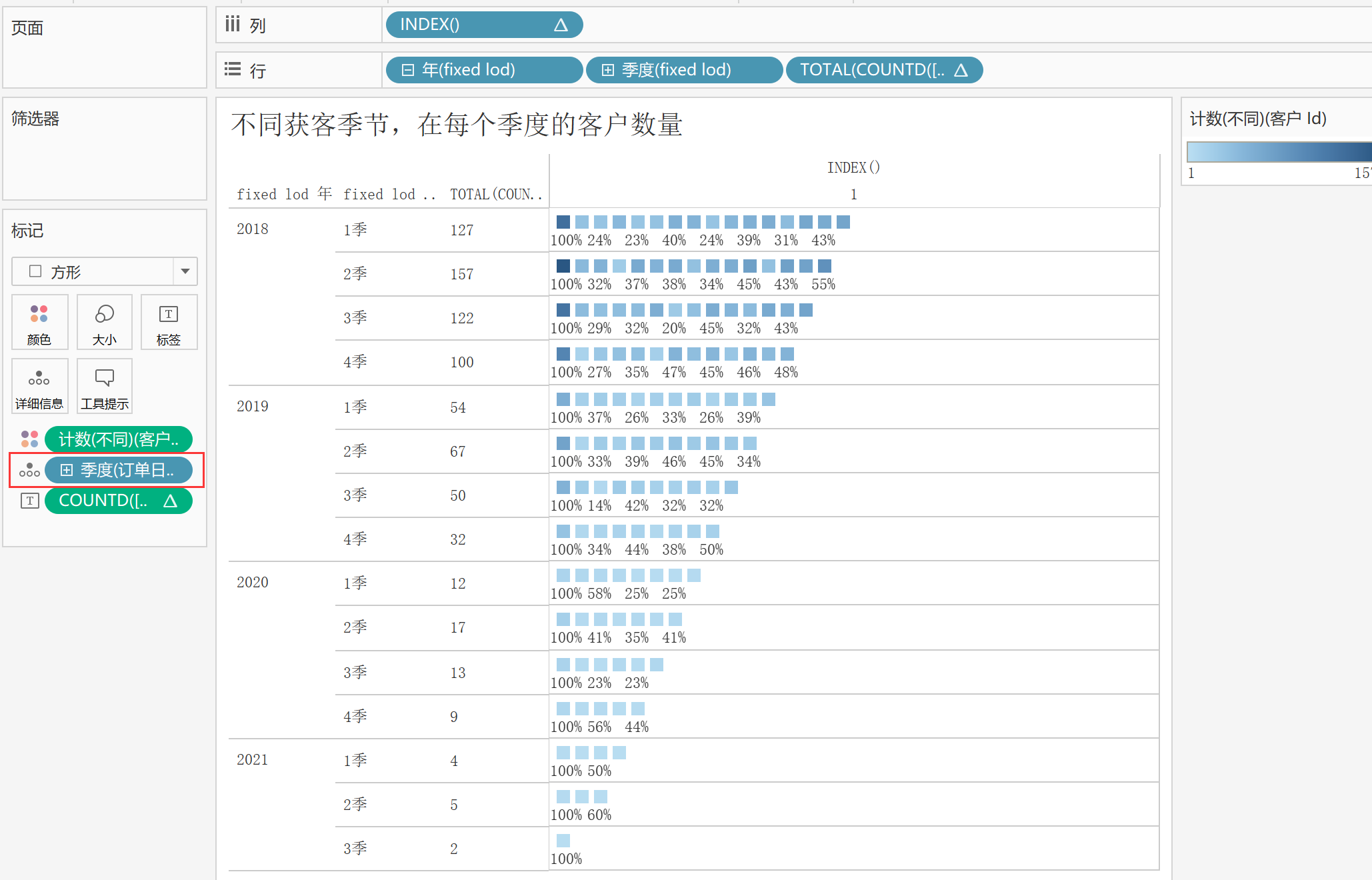 问题a就是要找到每个获客季度的客户数量,这个数据是可以由不同消费日期的客户数量,通过不重复的计算countd获得。获客季度的客户数量,层次高于当前视图。