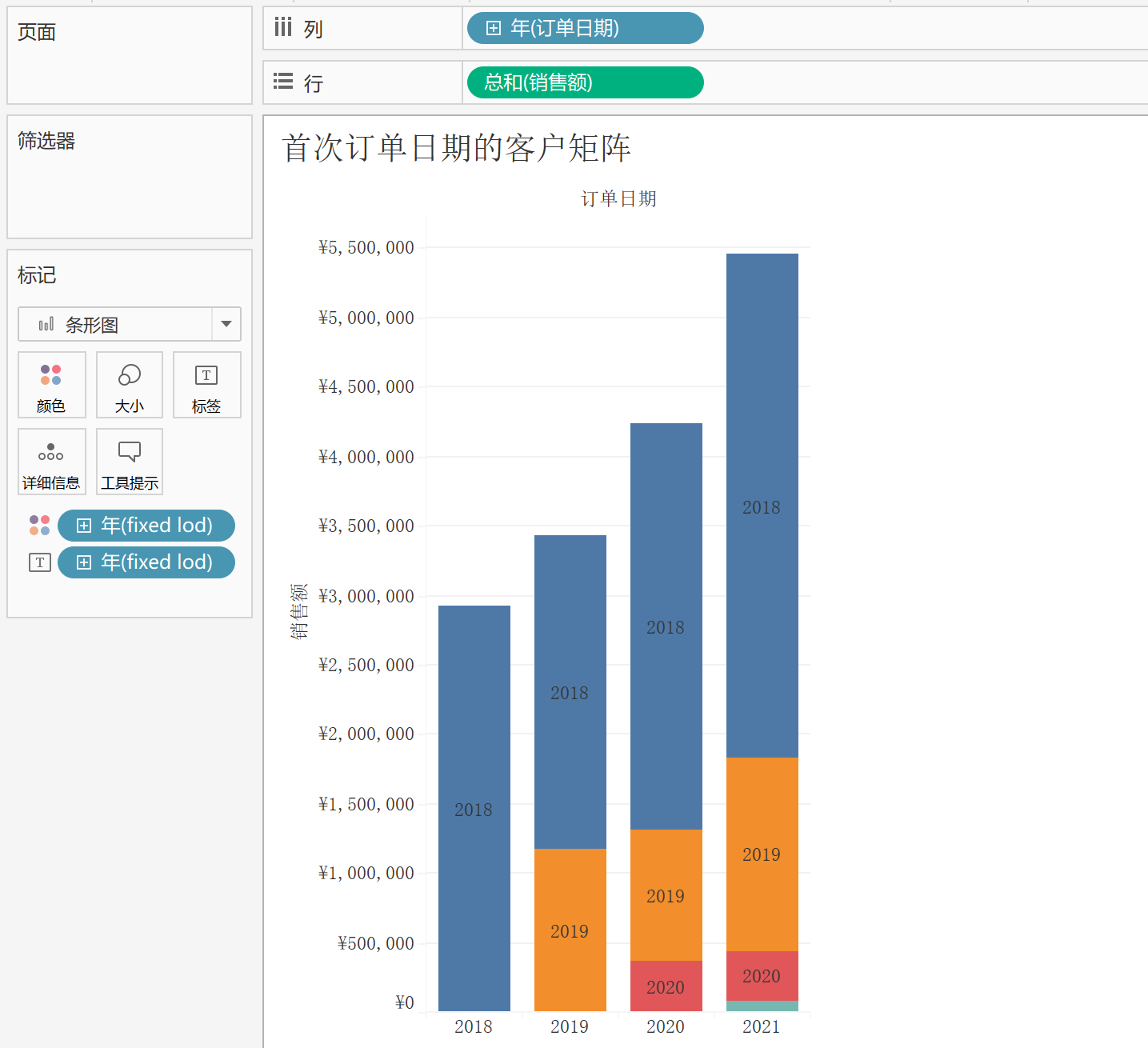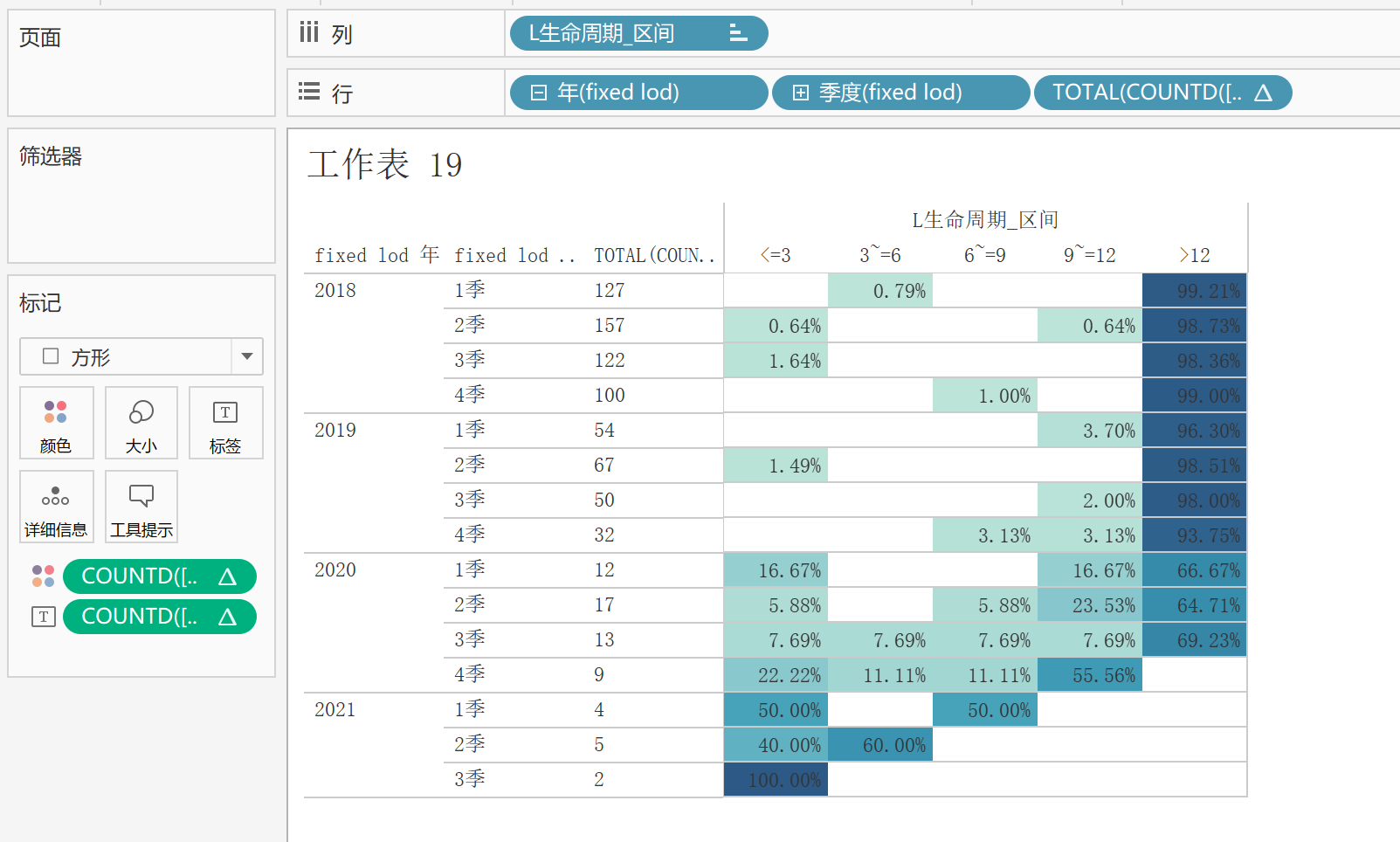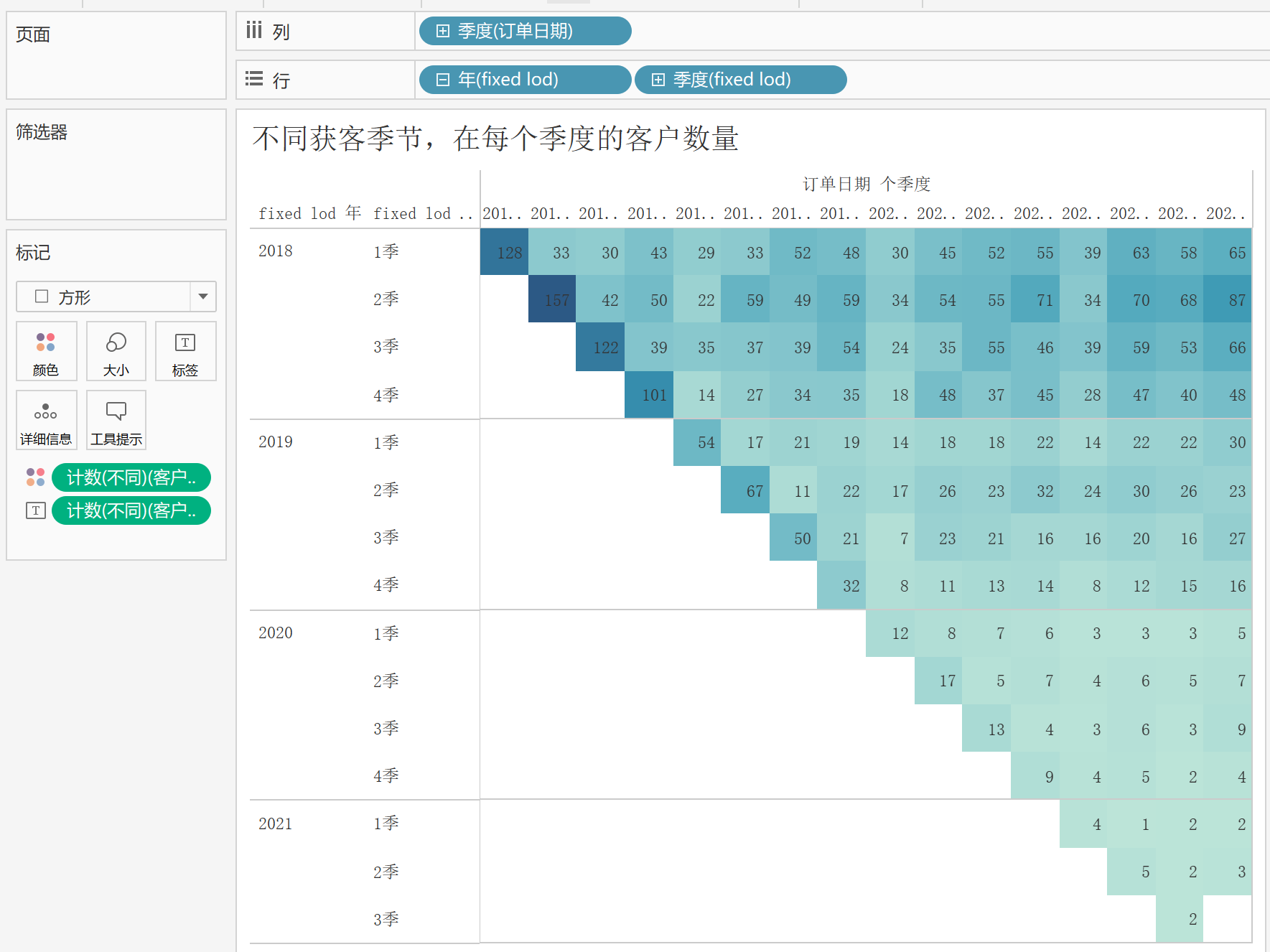 视图的维度是“季度”(层次是客户,聚合是sum客户名称),我们要引用“每个客户的首次订单所在的季度”(层次是客户,聚合是min订单日期),很明显二者是独立的层次,因此使用fixed lod计算返回每位客户的首次订单日期以识别客户为哪年的新客户。之后将这个字段加入到视图中,作为颜色。这样就是“客户不同获客季度矩阵,在接下来各个订单日期季度消费的客户数量”。