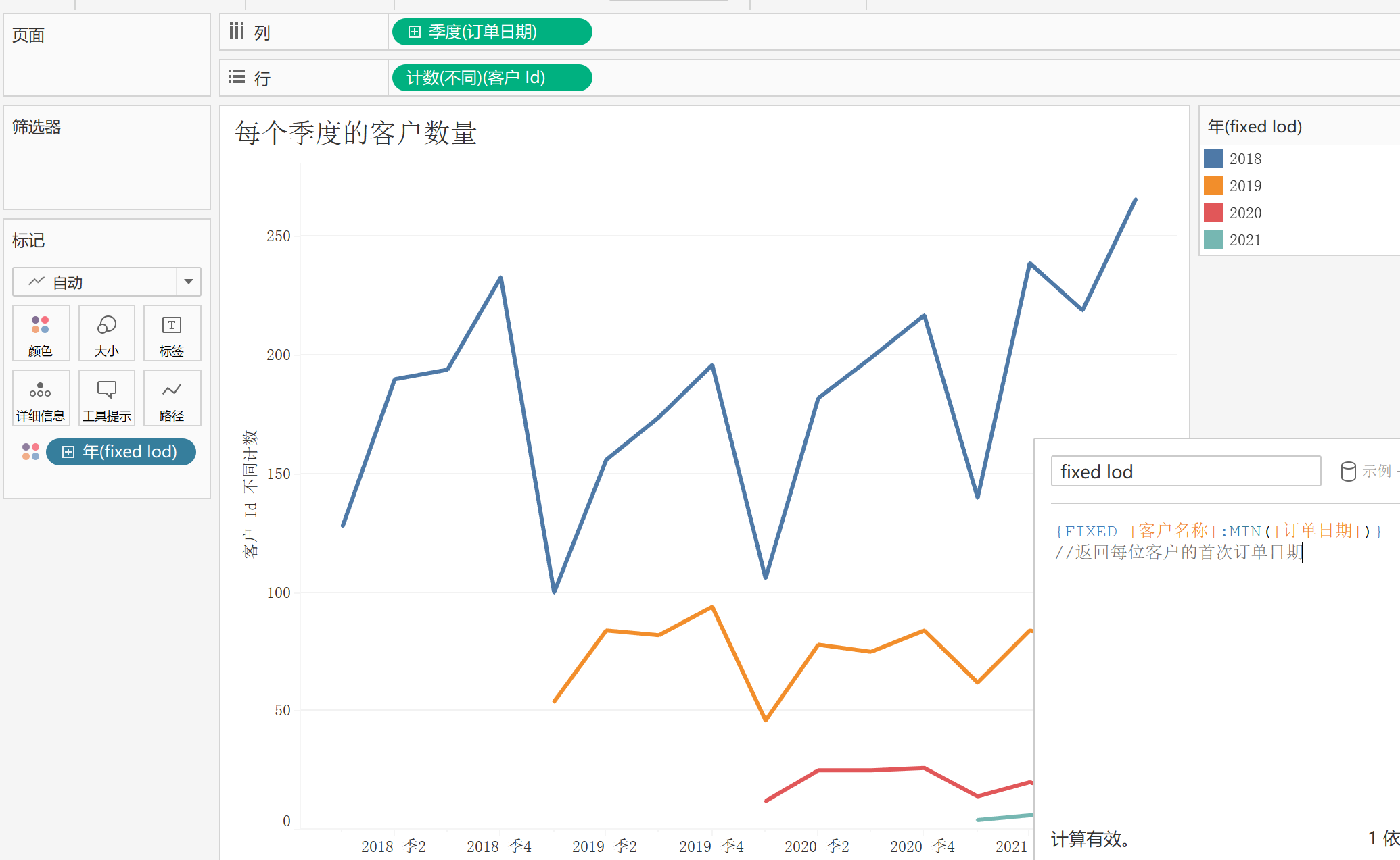 视图中是对客户的计数,而生命周期来自客户层次的计算,因此这里使用fixed lod在客户层次计算每个客户的生命周期,生命周期又依赖于每个客户的首次订单日期和最后一次订单日期。