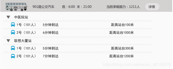 }private void setDistance(final int BusStationId, final String result) {getActivity().runOnUiThread(new Runnable() {@Overridepublic void run() {try {JSONObject jsonObject = new JSONObject(result);String content = jsonObject.getString("ROWS_DETAIL");JSONArray array = new JSONArray(content);if (BusStationId == 1) {if (list1.size() != 0) {list1.clear();}for (int i = 0; i < array.length(); i++) {JSONObject object = array.getJSONObject(i);int distance = object.getInt("Distance");int busId = object.getInt("BusId");double time = distance / (1000 / 3);DecimalFormat df = new DecimalFormat("#");ChildrenStrings childrenStrings = new ChildrenStrings(busId, Integer.parseInt(df.format(time)), distance);list1.add(childrenStrings);}//排序Collections.sort(list1, new Comparator<ChildrenStrings>() {@Overridepublic int compare(ChildrenStrings t, ChildrenStrings t1) {if (t.getDistance() > t1.getDistance()) {return 1;} else {return -1;}}});ParentStrings parentStrings = new ParentStrings("中医院站", list1);if (list.size()!=0){list.clear();}list.add(parentStrings);} else if (BusStationId == 2) {if (list2.size() != 0) {list2.clear();}for (int i = 0; i < array.length(); i++) {JSONObject object = array.getJSONObject(i);int distance = object.getInt("Distance");int busId = object.getInt("BusId");double time = distance / (1000 / 3);DecimalFormat df = new DecimalFormat("#");ChildrenStrings childrenStrings = new ChildrenStrings(busId, Integer.parseInt(df.format(time)), distance);list2.add(childrenStrings);}Collections.sort(list2, new Comparator<ChildrenStrings>() {@Overridepublic int compare(ChildrenStrings t, ChildrenStrings t1) {if (t.getDistance() > t1.getDistance()) {return 1;} else {return -1;}}});ParentStrings parentStrings = new ParentStrings("联想大厦站", list2);list.add(parentStrings);adapter = new BusAdapter(getContext(), list);expandList.setAdapter(adapter);//进入界面默认展开二级菜单int count = adapter.getGroupCount();for (int i = 0; i < count; i++) {expandList.expandGroup(i);}//关于二级菜单的刷新,一定要理清自己代码的逻辑,再setAdapter}} catch (JSONException e) {e.printStackTrace();}}});
