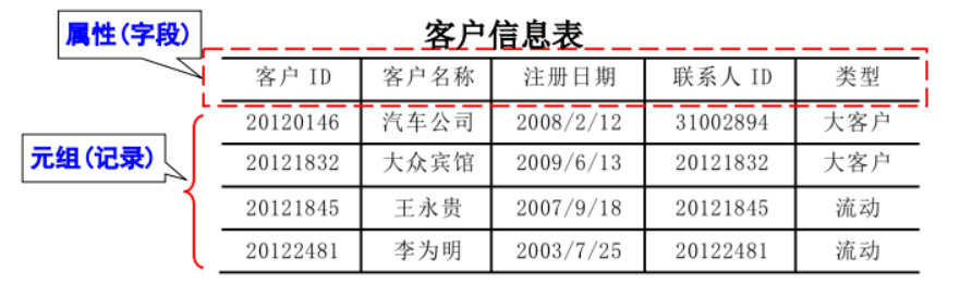 关系中的每一行数据(记录)称做一个元组,其列数据称做属性,列标题称做属性名。