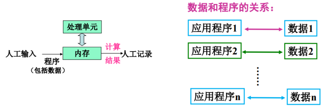 1、人工管理阶段(程序员管理阶段):人工通过单个应用程序处理单个数据