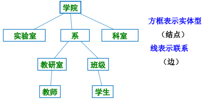可以有一个或多个子节点,当然也允许无子节点被称为叶;每个节点对应一个记录型,即对应概念模型中 的一个实体型,每对节点的父子 联系隐含为1对多(含1对1)联系。