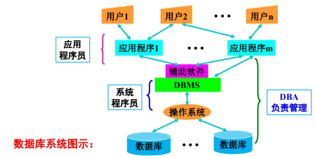 用户、应用程序员、数据库管理员:用户就是使用数据库的人,应用程序猿是造软件方便用户使用的人,数据库管理员就是管数据库的