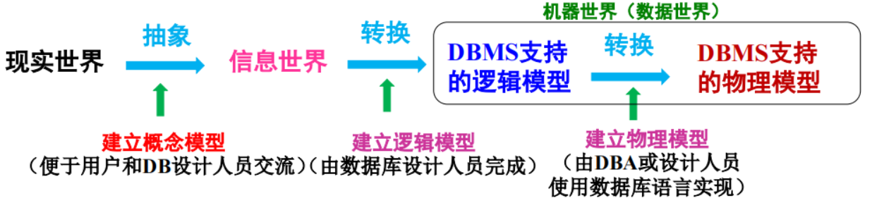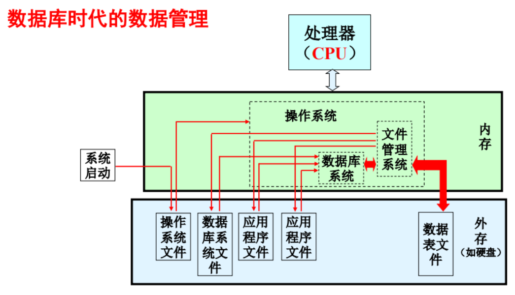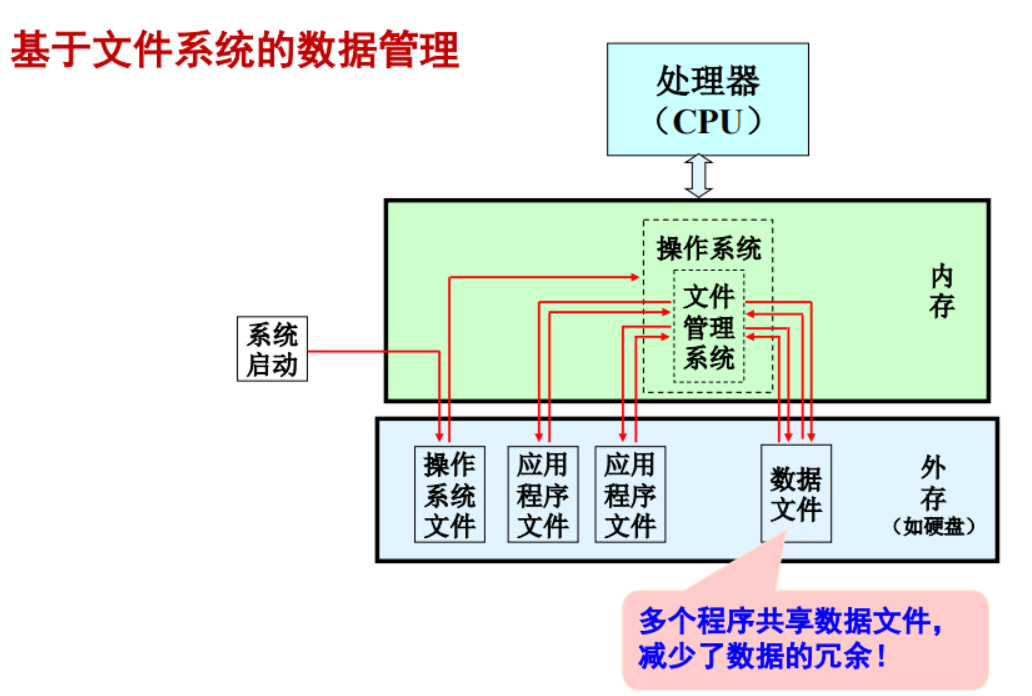 3、数据库系统阶段:文件系统不能适应大数据量、多应用共享数据的根本原因:数据没有集中管理,所以通过数据库统一管理、控制、共享使用,所以通过由DBMS控制多个应用程序和数据库