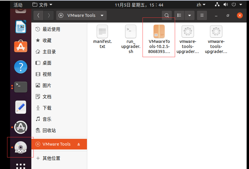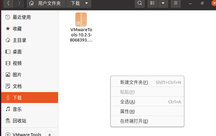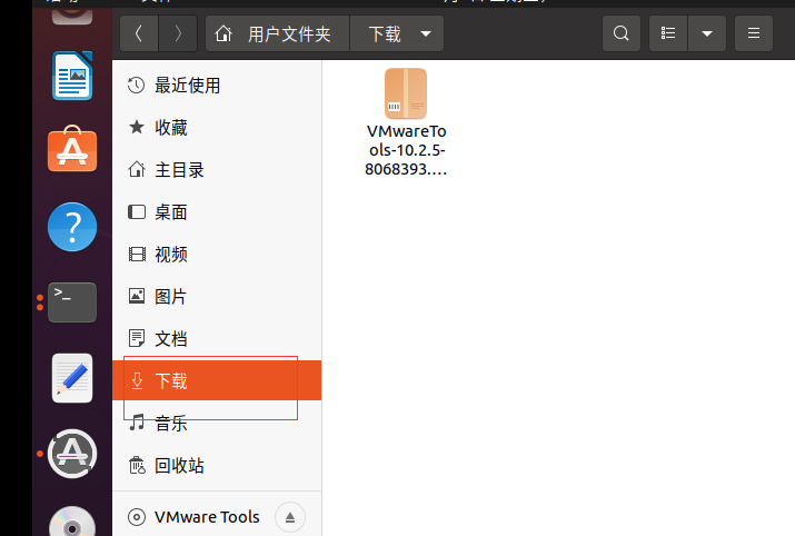 点击光盘,里面有个VMwareTools的文件,将文件拖入下载中