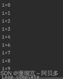 public class Text {public static void main(String[] args) {int i;for(i=0; i<10; i++) {if(i==5){continue;}System.out.println("i="+i);}System.out.println("Loop complete");}