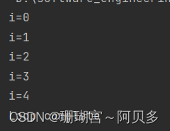 public class Text {public static void main(String[] args) {int i;for(i=0; i<10; i++) {if(i==5){break;}System.out.println("i="+i);}System.out.println("Loop complete");}