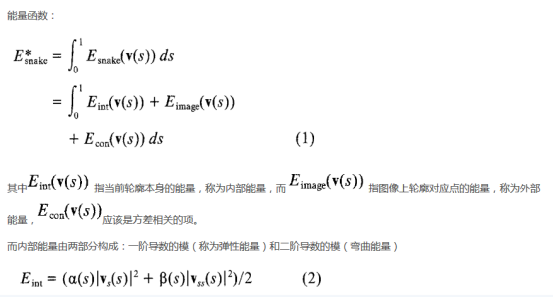Snake能量函数是有内部能量函数和外部能量函数组成,内部能量控制轮廓的平滑性和连续性,外部能量由图像能量和约束能量组成,控制轮廓向着实际轮廓收敛,其中约束能量可根据具体的对象形态定义,使得snake具有很大的灵活性。