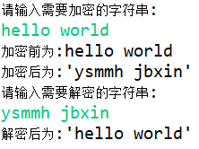 public class Test {public Test() {EnigmaCoder coder = new EnigmaCoder(0,0,0);BufferedReader in = new BufferedReader(new InputStreamReader(System.in)); //ctr + shift + otry {System.out.println("请输入需要加密的字符串:");String str = in.readLine();System.out.println("加密前为:"+str);str = coder.encode(str);System.out.println("加密后为:'"+str+"'");coder.setCoder(0, 0, 0);System.out.println("请输入需要解密的字符串:");str = in.readLine();str = coder.encode(str);System.out.println("解密后为:'"+str+"'");} catch (IOException e) {// TODO Auto-generated catch blocke.printStackTrace();}}public static void main(String[] args) {Test ts = new Test();}}