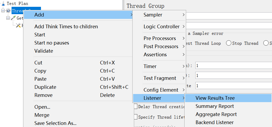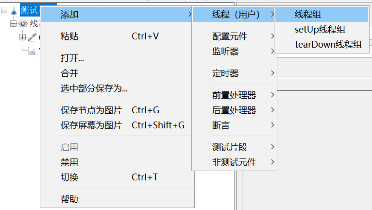 在测试计划下新建一个线程组, JMeter的所有任务都必须由线程处理,所有任务都必须在线程组下面创建。