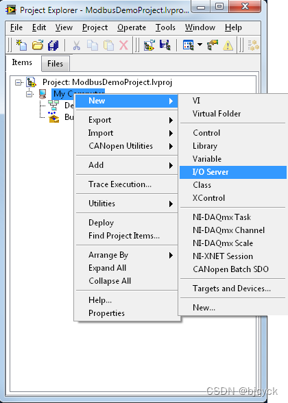 在LabVIEW Project窗口中,右键单击My Computer,然后选择New»I / O Server ,如图1所示。