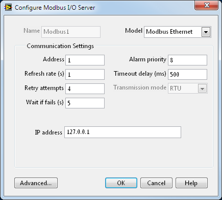 在文档的第一部分中,我们创建了一个Modbus主站,该主站将布尔值写入Modbus线圈。该线圈值存储在共享变量中,然后我们可以在分布式系统管理器中看到该变量。在下一节中,我们将展示Modbus从站如何读取主站正在更新的线圈值。我们在第一部分中创建的Modbus主站正在寻找IP地址为127.0.0.1(localhost)的Modbus从站。因此,如果我们想通过Modbus与Modbus主站通信,我们需要在本地计算机上创建一个Modbus从站。