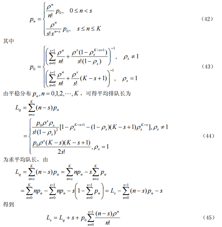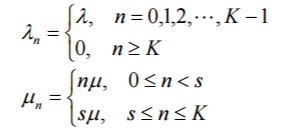 多服务台混合制模型 M / M / s/ K 是指顾客的相继到达时间服从参数为λ 的负指 数分布,服务台个数为 s ,每个服务台服务时间相互独立,且服从参数为 μ 的负指数分 布,系统的空间为 K 。