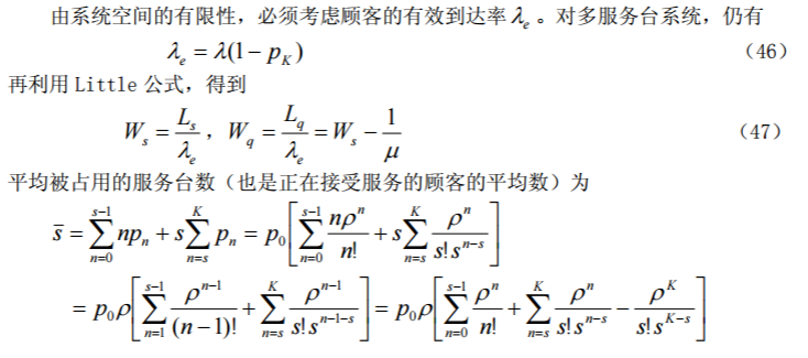 由于排队系统的容量有限,只有 K −1个排队位置,因此,当系统空间被占满时, 再来的顾客将不能进入系统排队,也就是说不能保证所有到达的顾客都能进入系统等待服务。假设顾客的到达率(单位时间内来到系统的顾客的平均数)为 λ ,则当系统处 于状态 K 时,顾客不能进入系统,即顾客可进入系统的概率是 。因此,单位时 间内实际可进入系统的顾客的平均数为: